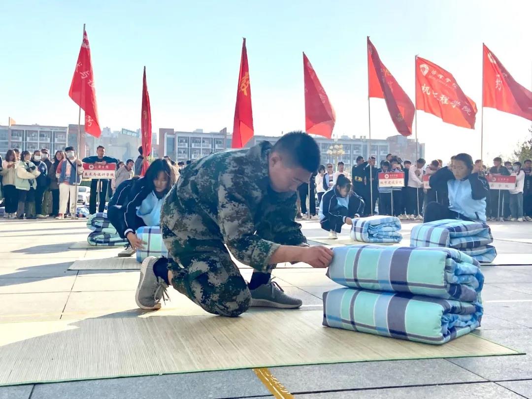 金秋送爽,寒冬送暖。迎着和煦的暖阳,各二级学院参赛队员积极进行赛前备战。听!高颜值主持人宣布千亿国际娱乐第五 届宿舍内务整理技能大赛正式开始;看!四位女生翩翩起舞,婀娜多姿,带来了勃勃生机的美好画面;退伍军人和女兵连代表迈着整齐的步伐缓缓走来,向大家展示内务整理。熟悉的手法,熟练的技巧,进行叠被子,叠军服。每一处细节、点滴,无不彰显军人的风采。在比赛休息之余,舞狮子,独舞表演,体操表演为本次比赛锦上添花。接下来,各二级学院参赛队员拿着自己的被子、凉席闪亮登场,在所属区域进行内务整理展示。在比赛期间,我院学予以饱满的态度,积极的状态进行比赛。他们将被子一摁一压,一步一步,整齐划一,熟悉的动作似乎在他们手中有了节奏感。就这样,被子整整齐齐,军服方方正正映入大家眼中。这独特的画面如同一幅山水画荡漾在大家心中。无论结果如何,能不能拿奖,我们都不在乎。我们在乎的是内务比赛过程中我院学子努力的点点滴滴。
