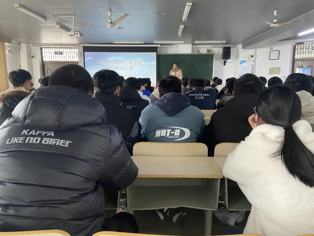 为激发我院学生报效祖国、献身国防的热情,宣传大学生参军入伍政策,12月11日,千亿国际娱乐于机电楼416召开2022年征兵政策解答会。我院退役军人张法明、刘来路、葛临昂及全体有参军意向的同学出席参加。