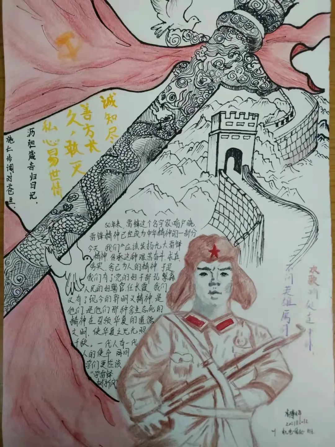 比赛通知下发后,各班级十分重视,同学们面对自己耳熟能详的雷锋事迹,积极性很高,充分发挥自己的想象力和创造力,用画笔定格当代雷锋的身影,与雷锋精神开展了一场跨越时空的对话。此次活动李博辉同学斩获了一等奖,他的作品体现了他对雷锋精神理解,作品的内容表现出了一种“把有限的生命投入到无限的为人民服务之中去”的高尚精神。