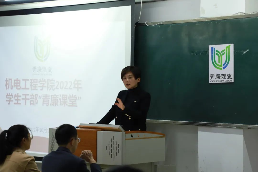 为进一步弘扬我院学生干部优良的工作作风,提高学生干部廉洁自律意识,提升学生干部队伍素质。10月17日,我院于机电楼416教室举办2022年学生干部“青廉课堂”主题活动,院党委副书记李谨辰,辅导员老师仵晓晗、赵相博、崔肖雪、邬瑜锦、陈传阳以及我院全体学生干部参加活动。
