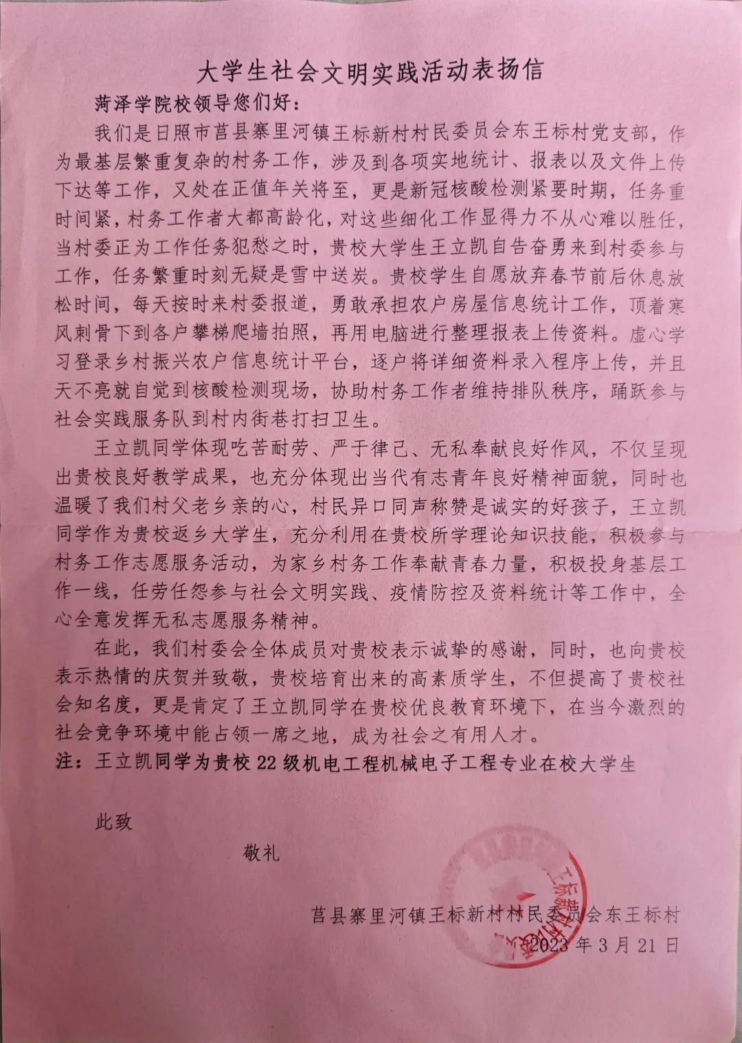 青春灼灼其华,担当历历在目。在全村疫情防控的关键时刻,王立凯同学积极参与村(社区)疫情防控工作及志愿服务活动,为疫情防控贡献青春力量。他挺身而出,开展宣传防疫、入户排查、卡点值守等工作,所到之处都留下了青春最美的身影。他将青年学子的热情和爱心奉献在疫情防控的最前沿,敢于冲锋、乐于奉献、执着坚守,为疫情防控工作增添了一抹亮丽的青春色彩,用实际行动诠释了新时代新青年的坚毅与担当。