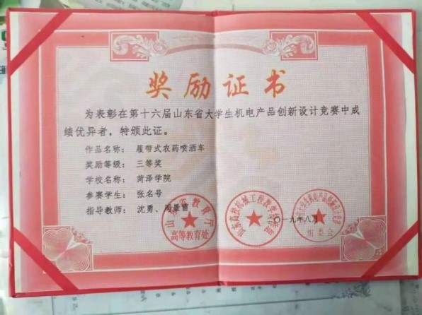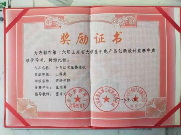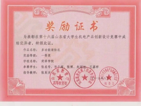 2019年7月,获山东省大学生机电产品创新设计大赛一等奖一项、三等奖两项。