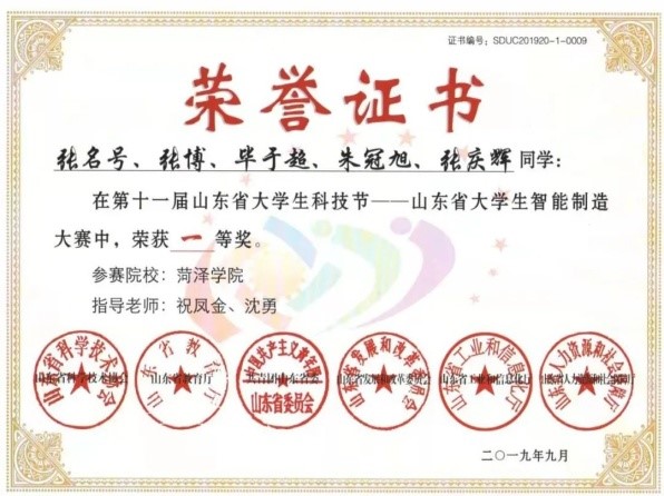 201 9年9月,获山东省大学生大学生智能制造大赛一等奖一项。