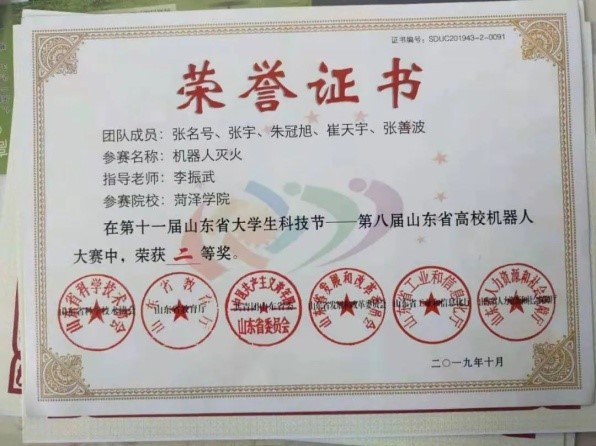 2019年10月,获山东省高校机器人大赛二等奖-项。