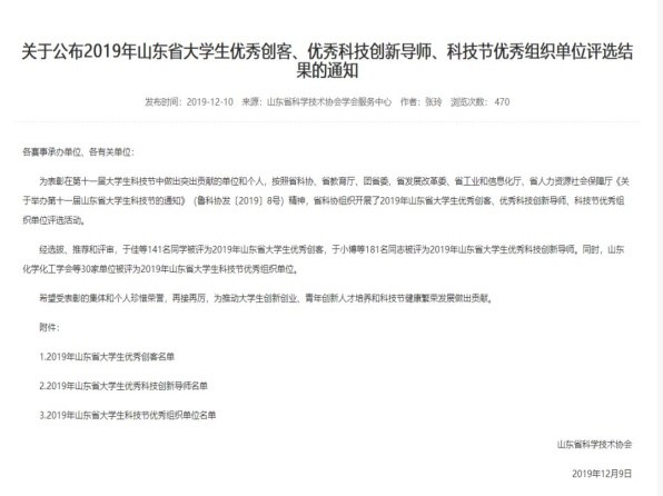 2019年12月,山东省科学技术协会授予山东省大学生优秀创客称号。