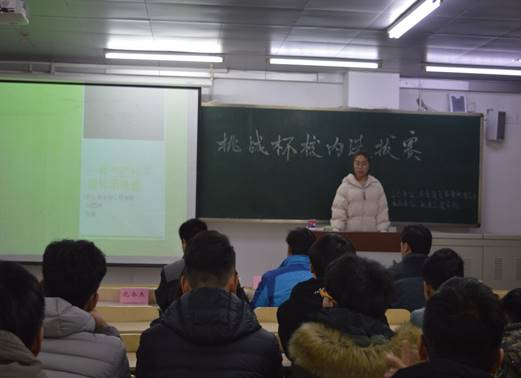 (通讯员 穆雪超)12月27日,第十七届“挑战杯”千亿国际娱乐校内选拔赛决赛在机电楼316、416教室举行。校团委书记祝磊、我院党委书记袁冬梅、副书记田丰莅临比赛现场,我院杨桂林、侯建华、周景雷、祝凤金老师和物理与电子工程学院赵光辉、孔令杰老师担当本次比赛评委。