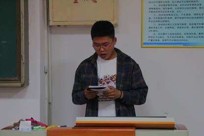 视频结束后,我院学生公寓党员工作站学生代表王昆武发言,他倡议同学们要主动向印春荣学习,学习他对党忠诚,学习他牢记宗旨、一心为民的公仆情怀。同学们也纷纷表示要学习榜样精神,同心有为,共筑中国梦。