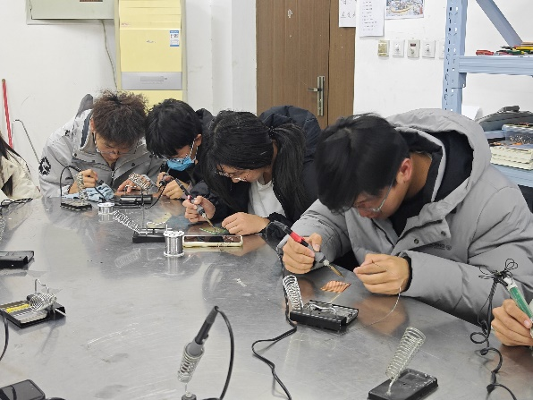 在这场比赛中,同学们化身为焊接达人,每位参赛者都全神贯注地投入到焊接工作中,一丝不苟地操作着。参赛选手们娴熟的拿起焊枪和焊锡,描绘着一块块奇思妙想的焊接板,挥洒着辛勤的汗水。随着时间一分一秒的过去,比赛也渐渐接近尾声。参赛选手们都在进行着最后的调整。一次又一次的重新焊点是选手对于作品质量的不懈追求,焊接板上流畅的“银线”是选手敏锐思维淋漓尽致的展现,选手们用一刻也不放松的态度和饱满激情的精神面貌迎接最后的时刻。