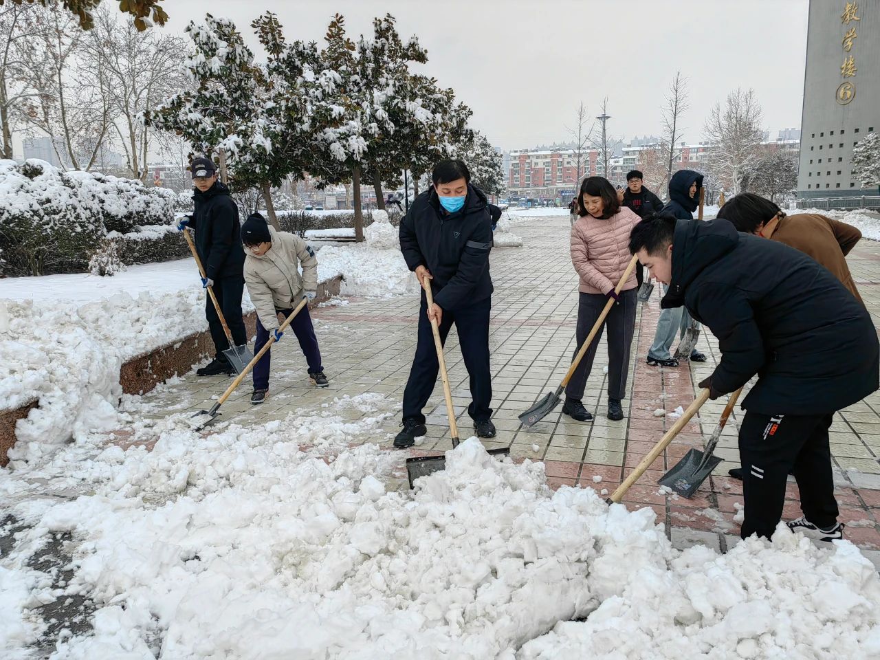 在清雪现场,大家配合默契、热情高涨,铁锹掀起的雪浪在空中留下了最美的身影,构成了这个冬日雪景中最靓丽的风景线。在大家的共同努力下,机电楼周围的积雪逐渐被清除,道路变得整洁、畅通。在清除积雪过程中,教职工和学生们充分发扬团结协作、无私奉献的精神。