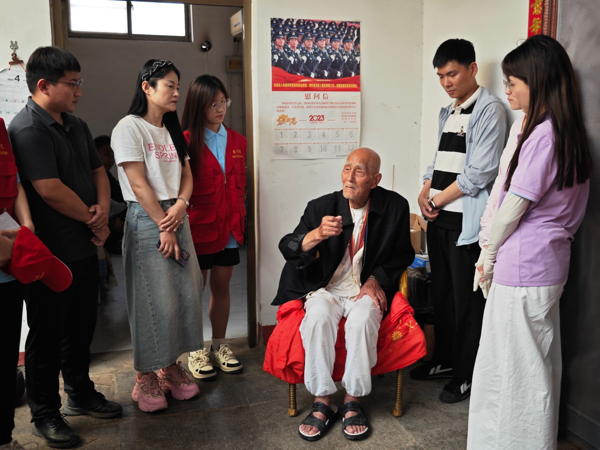 他热情地接待了志愿服务团队成员,大家围绕在他的周围,听他讲述起自己在抗美援朝战争中做通讯员的故事。在那段硝烟弥漫的时光里,他和战友们穿梭于枪林弹雨之间,时不时便会遭受美军战机的轰炸,在衣不御寒、食不果腹的艰苦条件下,传递一次又一次关键信息……曹老平静的讲述让大家感到了深深的震撼,队员们纷纷对他在那段峥嵘岁月里坚守初心使命的精神表示由衷地敬佩。