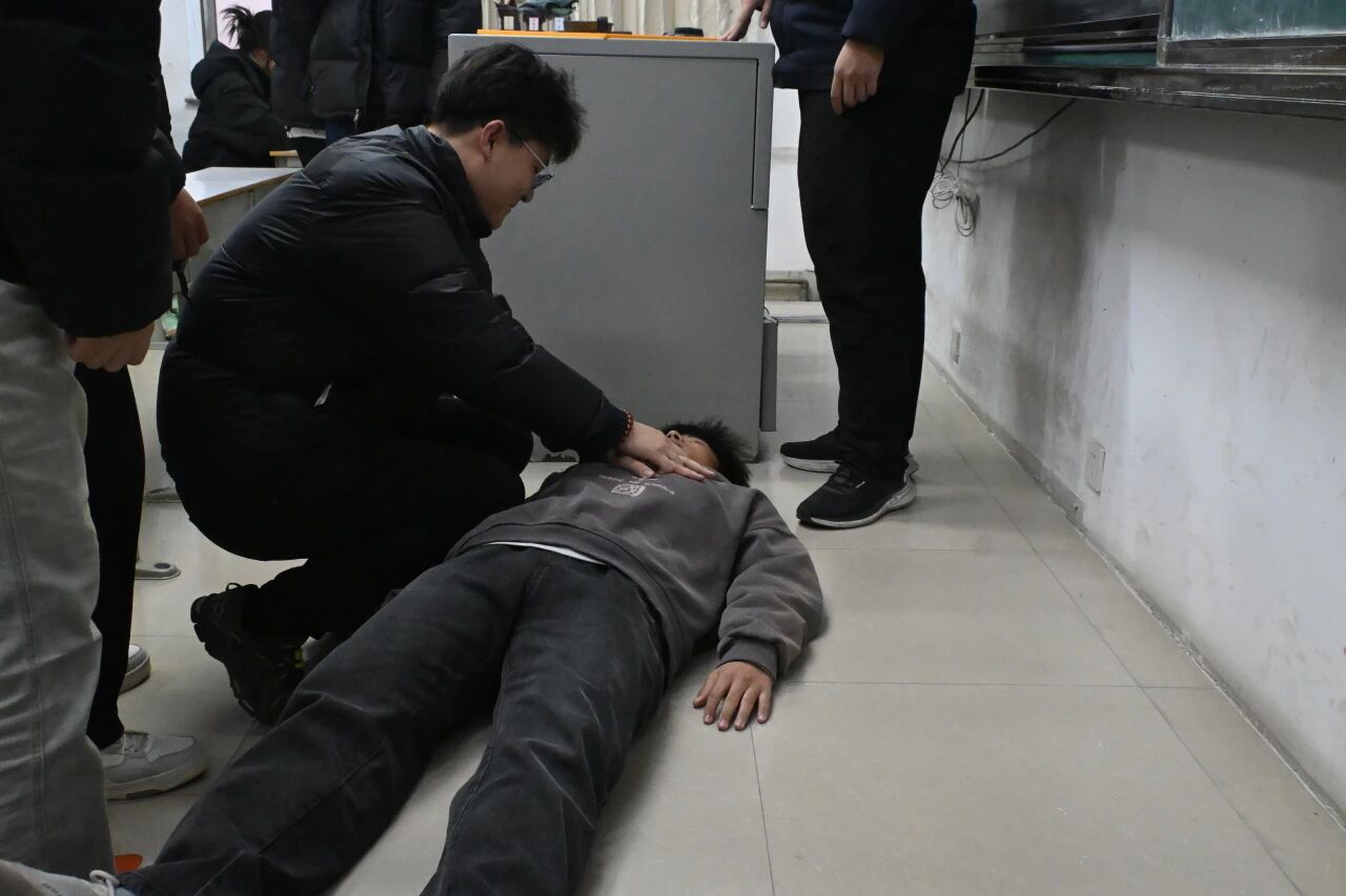 演练模拟学生突发晕倒情景。活动开始后,一位同学模拟课上身体突然出现异常状况的紧急场景。事件发生后,授课老师立即响应,轻声呼唤学生并观察其意识状态,完成初步情况判断,并安排班委在现场周边设置警戒、疏散围观人群,指派专人同步拨打校医室电话、急救电话以及对应辅导员电话,清晰说明事发具体位置、学生症状表现,并与医护人员以及校医保持沟通,时刻关注学生身体状况。在辅导员的陪同下,学生在第一时间被送往医院,现场老师组织在场人员有序离场,及时恢复现场秩序。整个演练过程指令清晰、响应迅速、协作有序,展现了我院学子良好的安全素养与应急处置能力。