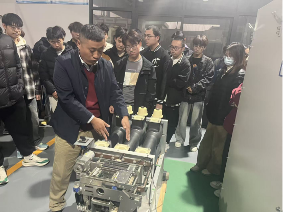 在企业负责人的陪同下,带领学生深入生产车间、研发区域,实地参观了产品生产流水线、智能化生产设备及研发实验区,详细了解了产品从研发设计、零部件加工到成品检测的全流程,近距离观察了集成一体化断路器模块等核心产品的生产工艺,直观感受了企业严谨的生产管理模式和浓厚的创新氛围。